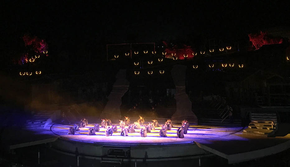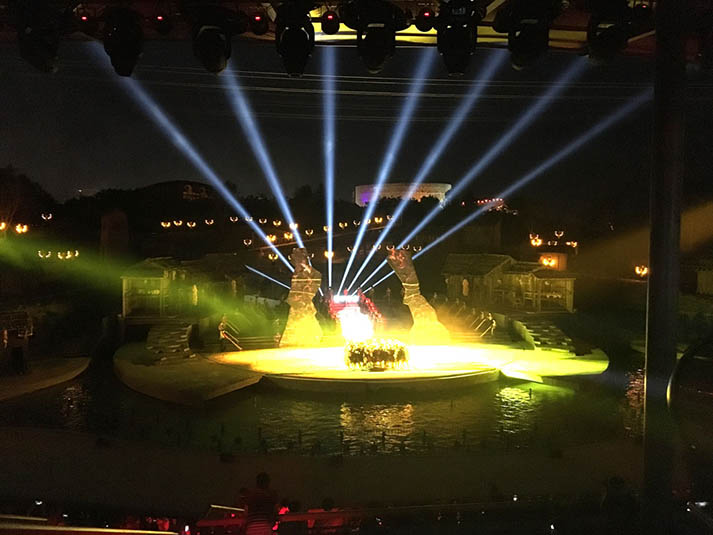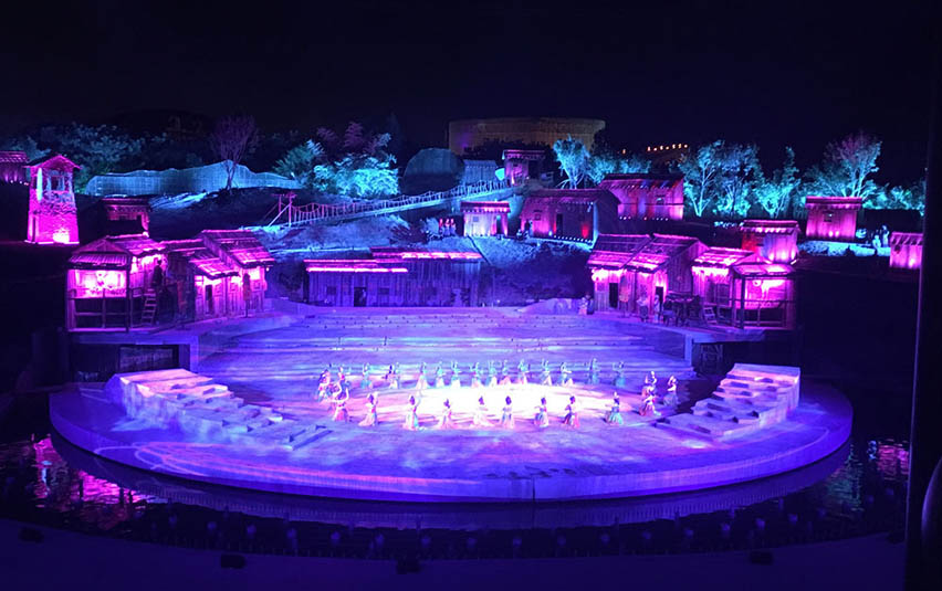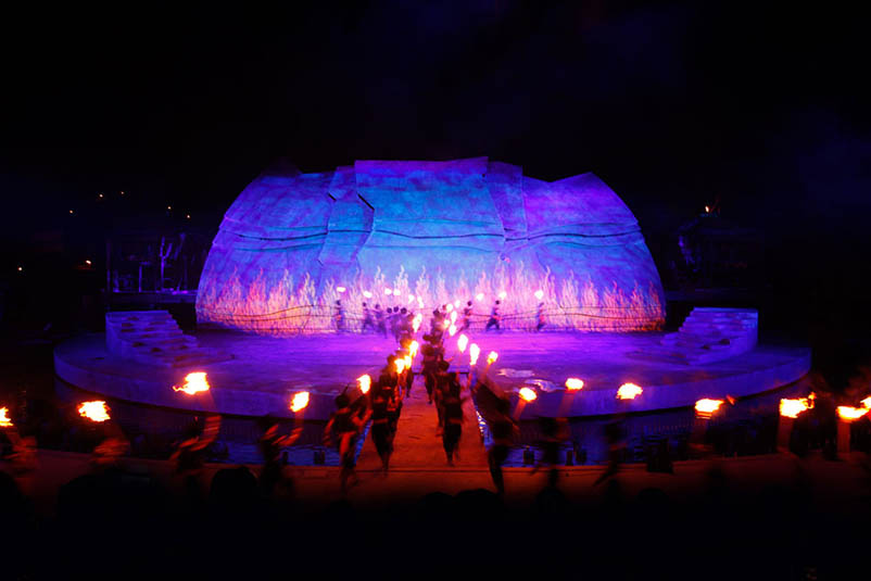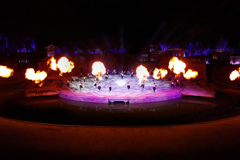 《阿惹妞》作為一部風(fēng)情實(shí)景劇,演出舞臺(tái)全部為戶(hù)外實(shí)景,既有遠(yuǎn)山又有流水,場(chǎng)景宏大,因此對(duì)舞臺(tái)景物布光要求很高,不僅要使景物光線(xiàn)分布均勻且達(dá)到足夠的亮度,對(duì)燈光的層次性要求也非常高,既要保證遠(yuǎn)方山峰的輪廓清晰可見(jiàn),又要讓觀眾看得清舞臺(tái)中區(qū)演員的表演。G12 HYBRID 能夠做到大范圍均勻鋪光,且具有超高光通量,發(fā)光效率高的同時(shí)具備遠(yuǎn)距離照射的能力,在保證遠(yuǎn)景和中景清晰的前提下,運(yùn)用G12 HYBRID亮度變化,配合現(xiàn)場(chǎng)光焰等特效,能夠制造出極具擴(kuò)張感的震撼視覺(jué)效果。