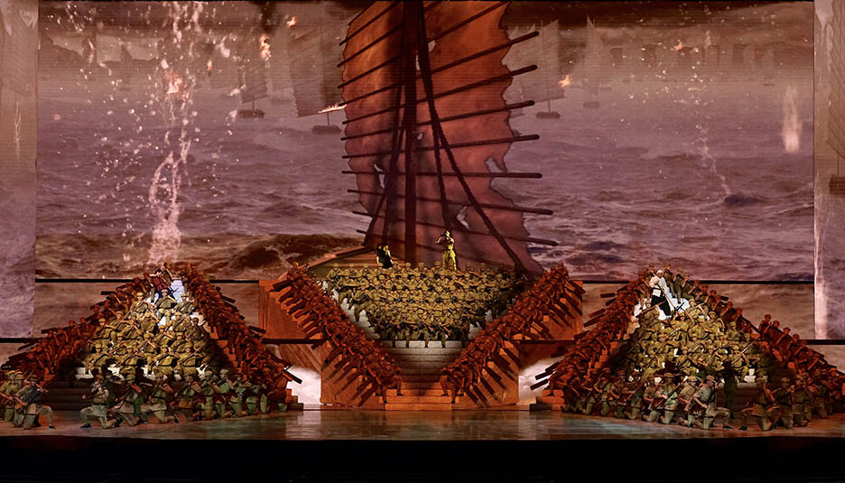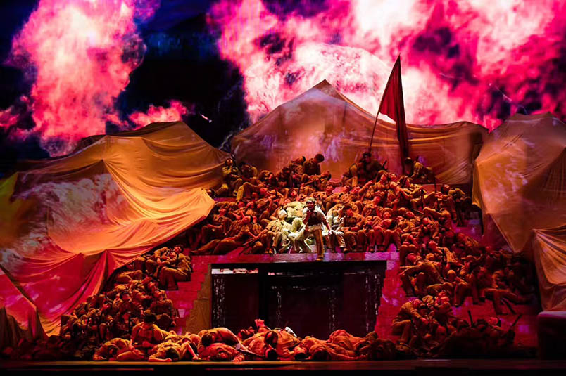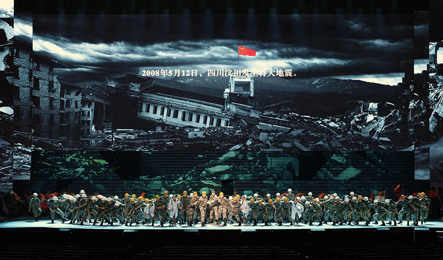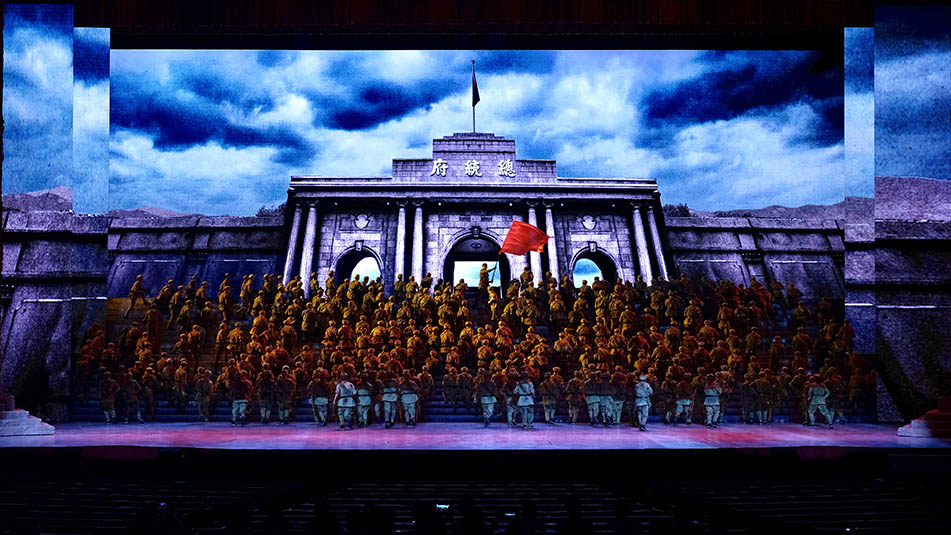 舞臺(tái)上舞美布景與燈光、視頻、投影等舞臺(tái)視覺(jué)形式的有機(jī)融合是晚會(huì)的亮點(diǎn)與難點(diǎn)。如此豪邁氣概的演出得益于晚會(huì)陣容強(qiáng)大的幕后團(tuán)隊(duì):總導(dǎo)演楊笑陽(yáng)、舞美總設(shè)計(jì)孫天衛(wèi)、燈光總設(shè)計(jì)沙曉嵐、音頻總設(shè)計(jì)何飚再加上其他行業(yè)精英成員強(qiáng)強(qiáng)聯(lián)合,以舞美、燈光、音響、投影、視頻、舞臺(tái)機(jī)械等多種舞臺(tái)手段,呈現(xiàn)出恢弘壯麗的舞臺(tái)效果。