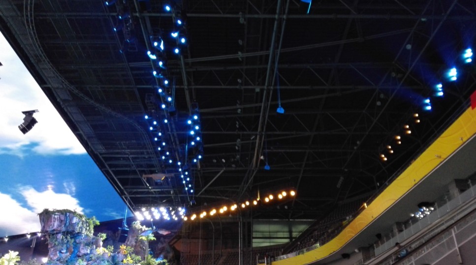 為更真實(shí)的反應(yīng)恐龍世界的自然環(huán)境,《遠(yuǎn)去的恐龍》將6000㎡高清LED巨幕組成舞臺的環(huán)幕背景和天空穹頂,這一創(chuàng)作突破了舞臺空間的枷鎖,在國家體育館這一密閉場館內(nèi),開辟了恐龍世界深遠(yuǎn)無際的遠(yuǎn)景和天空。而在觀眾席以外的場館空間,《遠(yuǎn)去的恐龍》構(gòu)建了表面積達(dá)11000㎡巨大的高度仿生的山、水、林木實(shí)體場景,將恐龍世界的地容、地貌完美地搬進(jìn)了國家體育館。