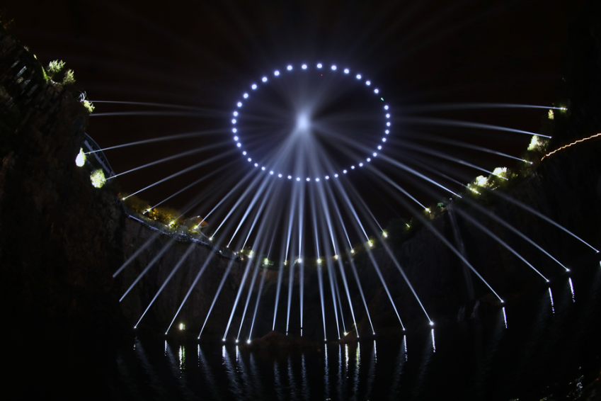 總導演王之綱最初的設計靈感來自于深坑酒店特殊的結構和位置,建筑在一個環(huán)形深坑里的深坑酒店有著天然的回音結構。因此,在被世茂集團邀請為深坑酒店設計一場量身打造的新媒體藝術秀的時候,王之綱提出了“回響”這個概念。