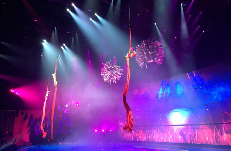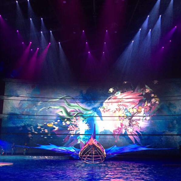 與以往單一劇場(chǎng)表演相比,《C秀》采用海陸空3D立體水舞臺(tái)劇場(chǎng),其中央水舞臺(tái)的容量高達(dá)7000立方米,相等于4個(gè)奧林匹克標(biāo)準(zhǔn)泳池的容量,水下密布的世界領(lǐng)先的舞臺(tái)技術(shù),能瞬間形成奇幻的水面神奇效果。海陸空三位一體的舞臺(tái)設(shè)計(jì),搭配三面環(huán)繞式立體的觀眾席,將舞臺(tái)與觀眾席融為一體,為觀眾置身于“沉浸式”的觀看體驗(yàn)。