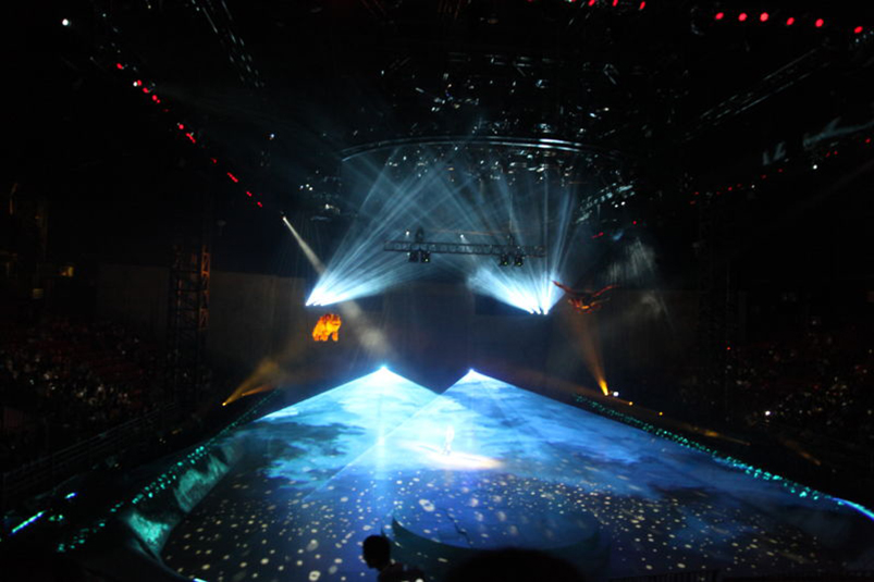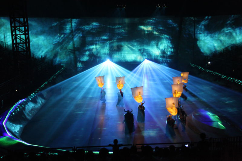 演出采用了浩洋電子近400臺燈具。舞臺上,維京少年騎龍奔跑跳躍,這里的龍不僅能上天入海、噴火放電,還會撒嬌耍賴,表情細膩逼真,在浩洋燈光的卓越顯色效果、高亮度輸出及投影的無縫銜接映襯下,共同營造了一個動感、超炫的舞臺,將童話中的維京人與飛龍共存的魔幻世界真正搬到了觀眾眼前。浩洋電子服務(wù)演出的燈具包括:84臺切割燈V3000P,24臺鉑金系列切割燈PT801P,240臺RGBW 四合一大功率LED 防水PAR燈OVAL 7D,50臺LED染色燈PB12A。浩洋燈光卓越效果、高亮度輸出、在演出中完美襯托出了超炫、動感動態(tài)的舞臺,將童話中的維京人與飛龍共存的魔幻世界真正的搬到了觀眾眼前。
