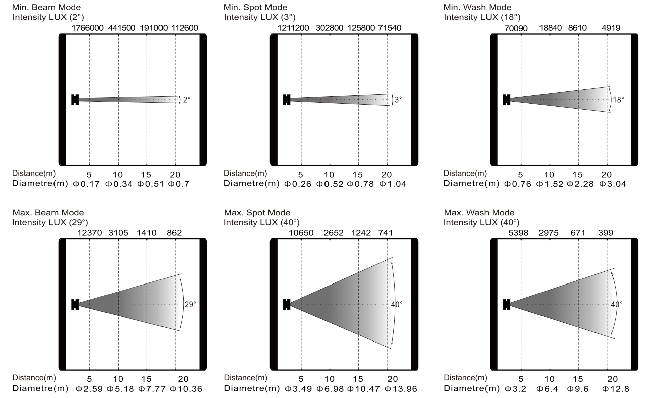 變焦范圍:光束模式: 2°-29°, 圖案模式: 3°-40°, 染色模式: 18 -40°