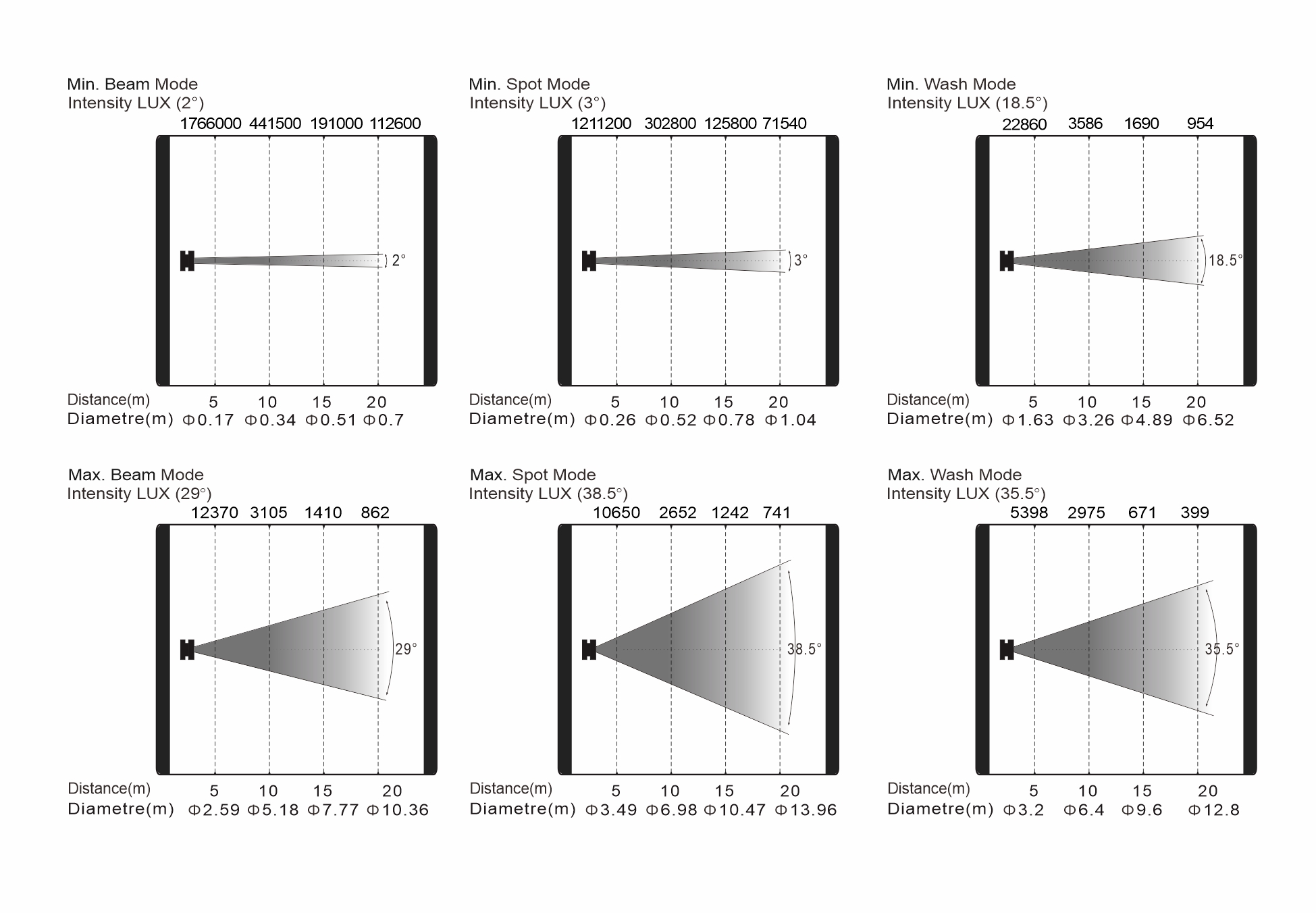變焦范圍:光束模式: 2°-29°, 圖案模式: 3°-38.5°, 染色模式: 18.5 -35.5°